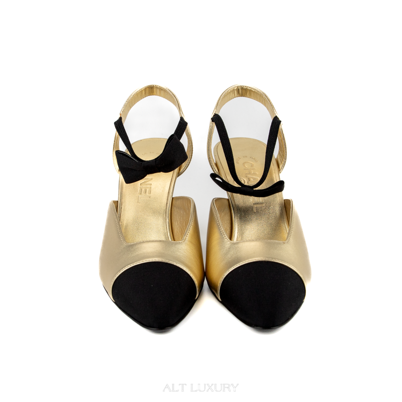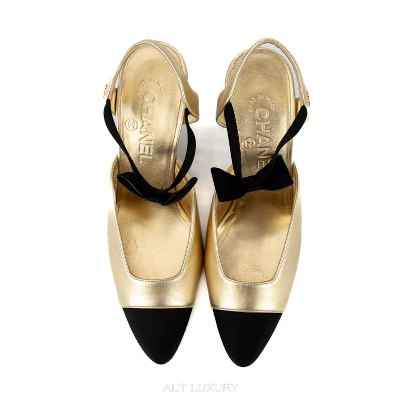 CHANEL Slingback Pumps từ bộ sưu tập năm 2020 là biểu tượng của sự thanh lịch và tinh tế – kế thừa thiết kế slingback huyền thoại do chính Gabrielle Chanel ra mắt từ năm 1957. Mẫu giày sử dụng chất liệu da cừu ánh kim cao cấp, kết hợp phần mũi giày bọc vải đen đặc trưng, cùng logo CC nổi bật phía bên cạnh, tạo nên diện mạo vừa hiện đại vừa cổ điển.