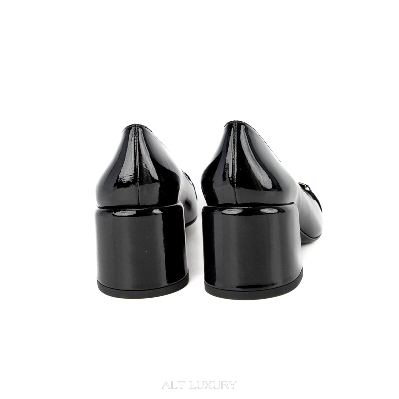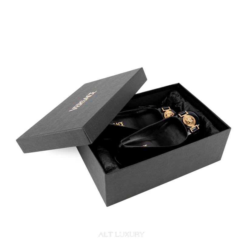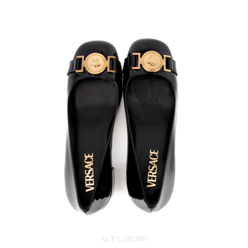 Giày Cao Gót Nữ VERSACE – Square Toe Patent Leather Black & Gold – Mới 98% Full Box